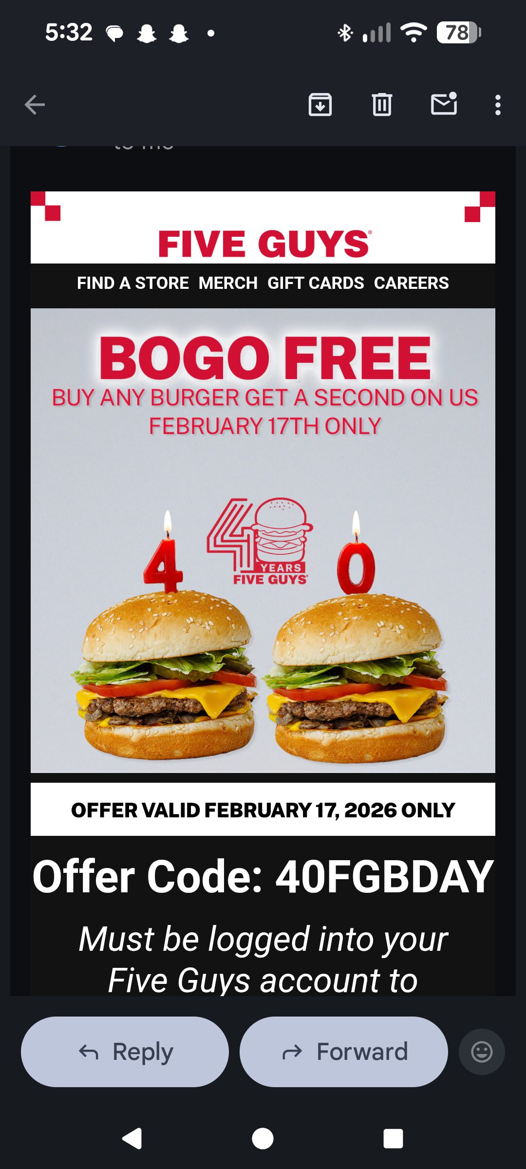 [Five Guys] BOGO Burger Offer: Enter Code 40FGBDAY for a Free Burger of Equal Value